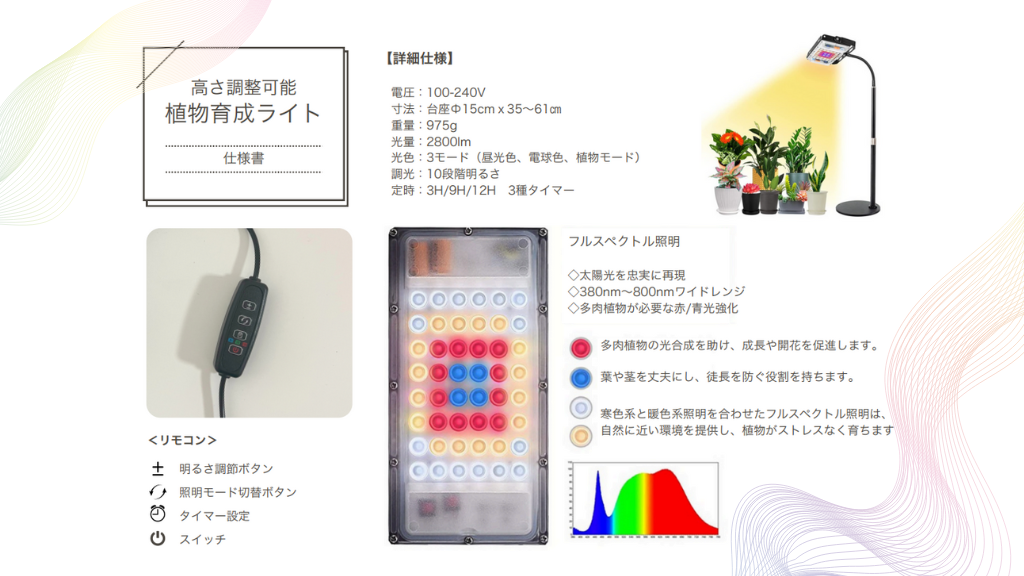 北海道にある多肉植物専門店からの開発依頼によって、多肉植物の生長に最適化された専用LED育成ライトを自社開発しました。